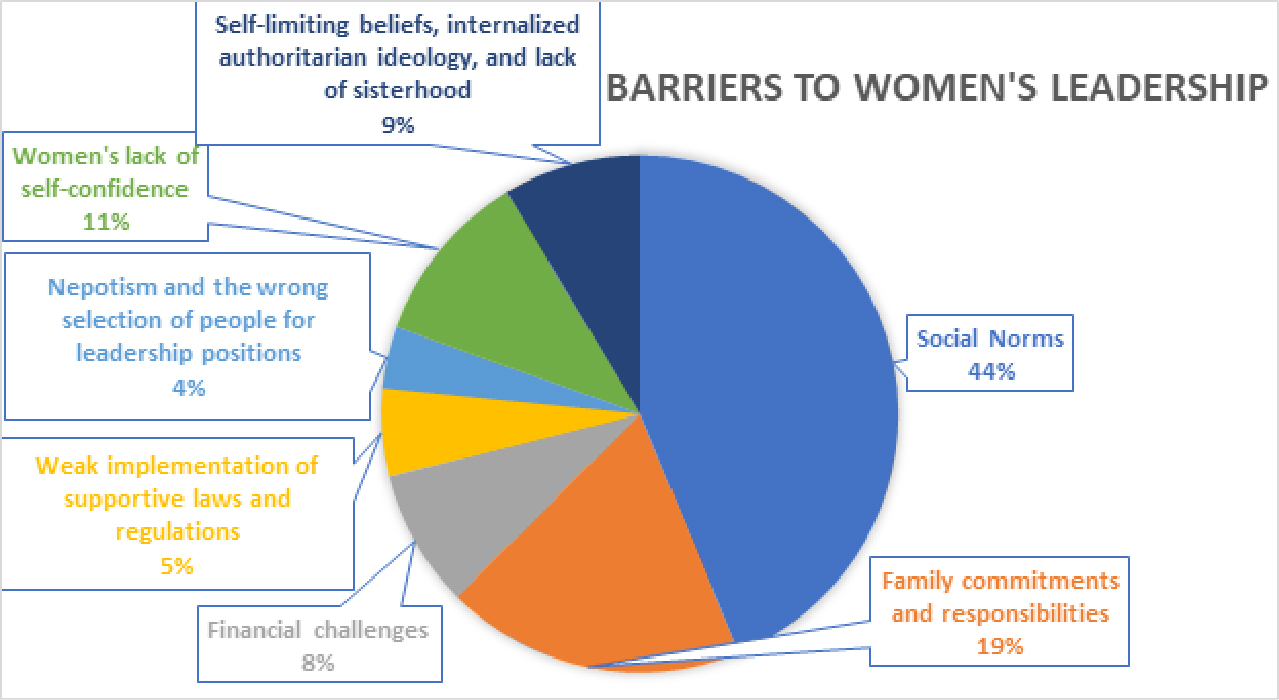 Field experience and recent studies including Women’s Leadership Needs Assessment (2023–2024) conducted by ARDD with 123 Jordanian women from diverse governorates and backgrounds reveal that the barriers women face in reaching leadership positions are multifaceted, combining structural, personal, social, and behavioral dimensions. These challenges manifest primarily as follows: