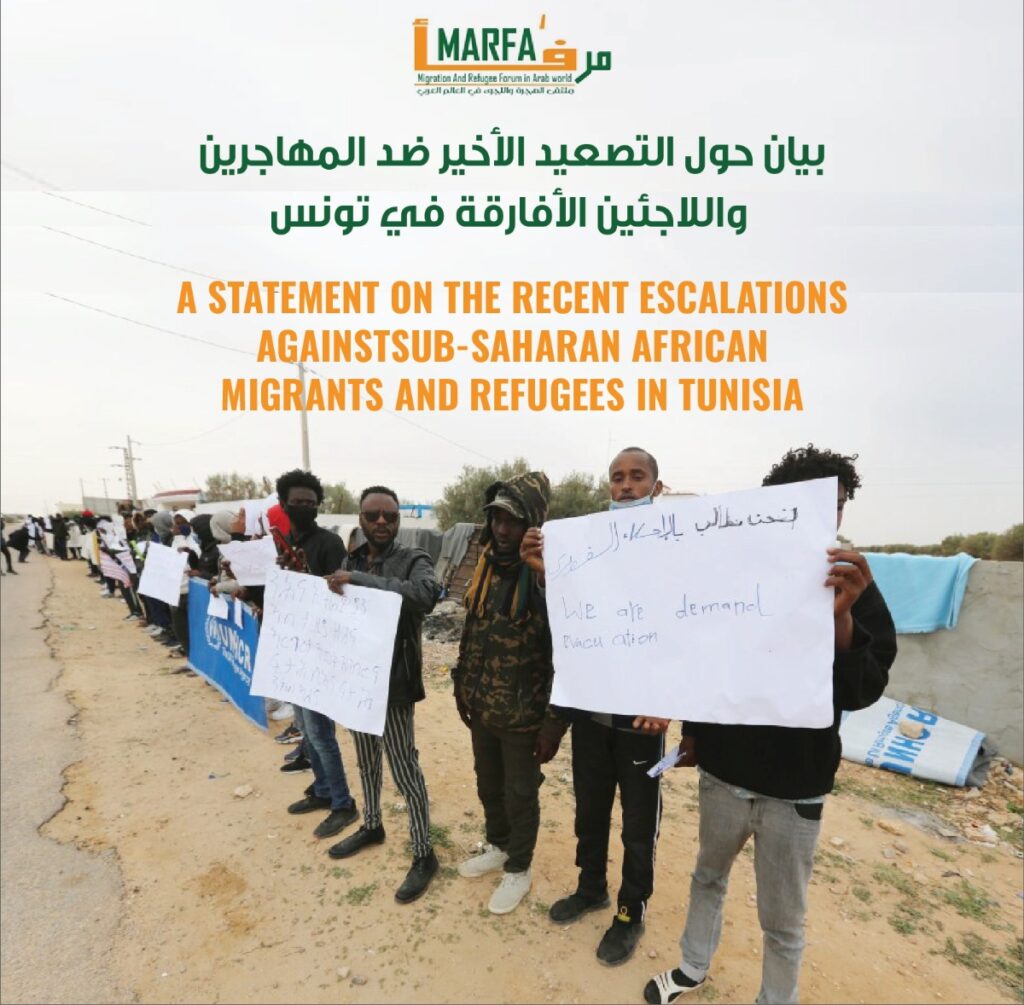 We, members of the Migration and Refugee Forum for the Arab World (MARFA) condemn the recent escalation of violence against migrants and refugees from Sub-Saharan Africa in Tunisia, and deeply regret the official statements that unleashed it. We remind the Tunisian government that this is contrary to the international human rights treaties Tunisia signed, including the 1951 Convention relating to the Status of Refugees and the International Convention on the Elimination of All Forms of Racial Discrimination.