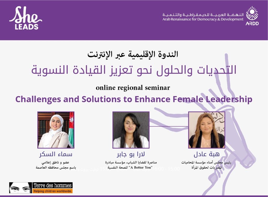 In accordance with this goal, the Arab Renaissance for Democracy and Development (ARDD) and the Terre des Hommes organization held a regional digital seminar on Tuesday, November 14, 2023, entitled: “Challenges and Solutions Towards Strengthening Women’s Leadership”, to support participants in understanding their leadership roles by discussing the tools, skills, current challenges, and basic knowledge that women need for leadership, and to inspire them to take leadership paths through the examples and stories shared by the speakers who hold leadership positions in various fields, to serve as role models for them, within the framework of the She Leads program.