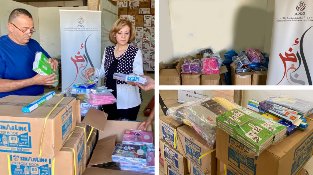 To emphasize the right to comprehensive and quality education for all members of society, the Arab Renaissance for Democracy and Development (ARDD), in recent cooperation with the Ministry of Social Development, donated various stationery and school bags to public school students in primary and middle grades, in various Jordanian governorates, in a gesture that has a positive impact on societal cohesion, solidarity and cooperation between institutions and individuals together, and the enhancement of community protection.