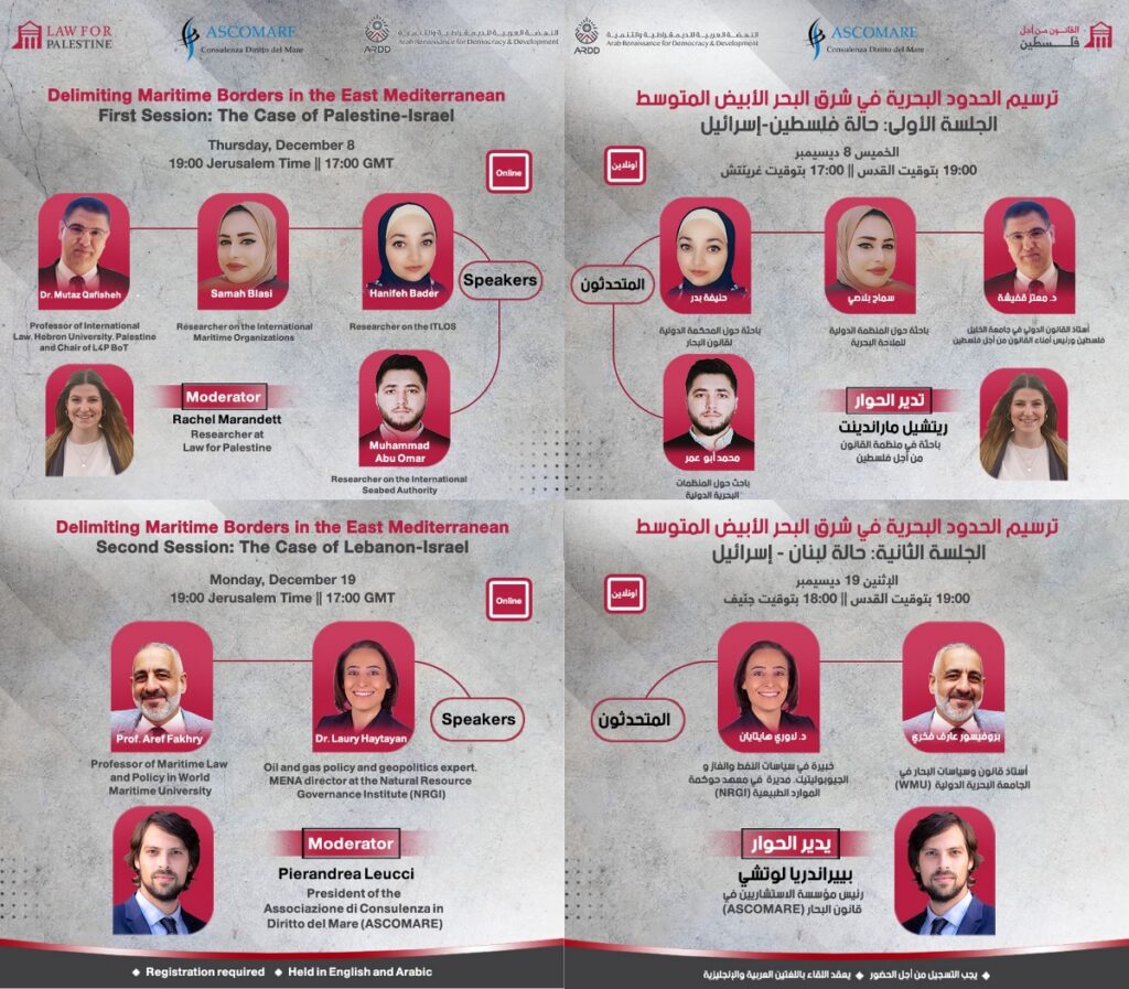 Associazione di Consulenza in Diritto del Mare (ASCOMARE), on behalf of the Consortium for the Study of Maritime Affairs and the Blue Economy (CONSMAR), also including the Ankara National Center for the Sea and Maritime Law (DEHUKAM), the Centro interdipartimentale di Ricerca sull’Adriatico e il Mediterraneo (CiRAM), and the International Center for Ocean Governance (ICOG) of the Western Sydney University, and in collaboration with Law for Palestine and ARDD are organizing a webinar on: Delimiting Maritime Borders in the East Mediterranean: The Case of Palestine-Israel and Lebanon-Israel