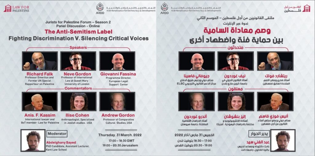 Jurists for Palestine Forum, one of Law for Palestine’s projects and the widest international network for legal professionals interested in the Question of Palestine, and in partnership with the Arab Renaissance for Democracy and Development (ARDD) as part of its Question of Palestine program, are pleased to announce a webinar on the Anti-Semitism Label: Between Fighting Discrimination and Silencing Critical Voices.