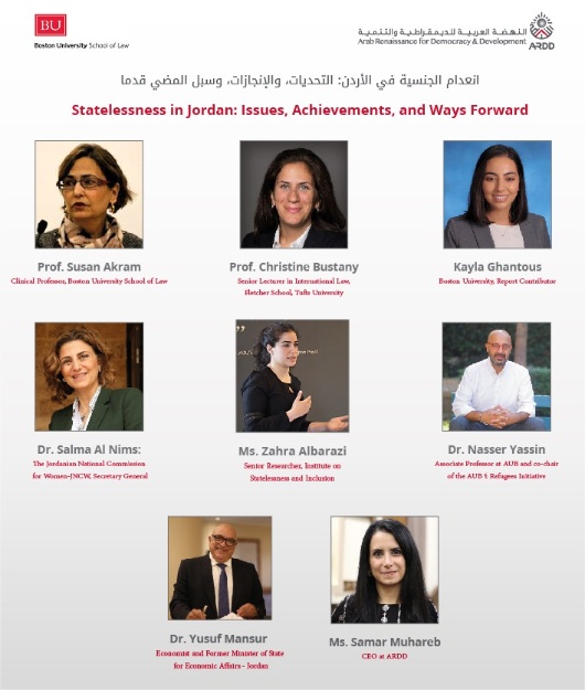 In partnership with Boston University School of Law International Human Rights Clinic (IHRC), the Arab Renaissance for Democracy and Development (ARDD) on Monday, March 1, 2021, held the online workshop “Statelessness in Jordan: Issues, Achievements, and Ways Forward”; taking part were stakeholders from non-governmental organizations, academic institutions and other concerned entities. At the workshop, a comprehensively researched report on statelessness and vulnerable refugee populations in Jordan, and the pertinent international, regional and domestic laws and policies was launched.