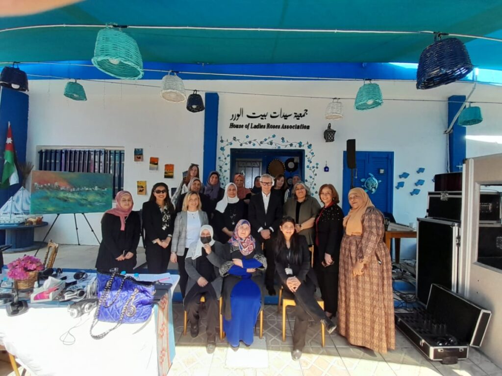 The visit included a meeting at the Beit Al-Ward Association in Aqaba with leaders and representatives of JONAF members: Al Nawaya Al Hassana Association, the Aqaba Women’s Association, the Tafila Women’s Association, the Ladies of Disa Villages Association, Al-Jawhara Charitable Association, and the Ghor Haditha Charitable Women’s Association, who emphasized the importance of local humanitarian action. The role of women in achieving solidarity and social peace.